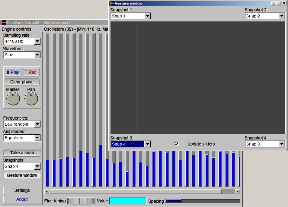 Sinewarp is a tool for additive synthesis; it lets you build and control up to 512 oscillators through high-level functions and vectorial control; moreover, it lets you record sounds in realtime and save spectra with snapshots.